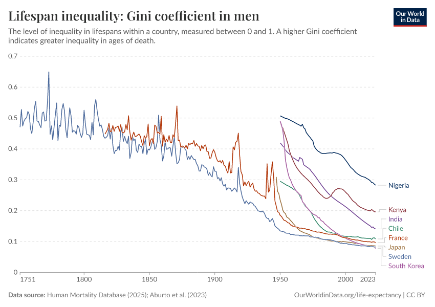 Human Mortality Database (2025); Aburto et al. (2023) – with major processing by Our World in Data. “Lifespan inequality: Gini coefficient in men” [dataset]. Human Mortality Database, “Human Mortality Database”; United Nations, “World Population Prospects” [original data]. Retrieved March 3, 2026 from https://country-profiles-in-search.owid.pages.dev/grapher/gini-coefficient-of-lifespan-inequality-in-males