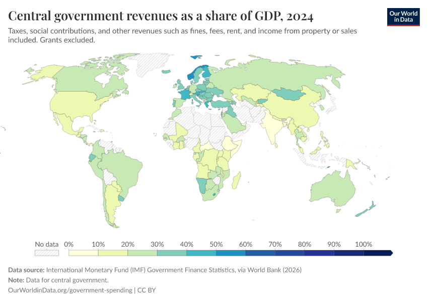 “Data Page: Central government revenues as a share of GDP”. Our World in Data (2026). Data adapted from International Monetary Fund (IMF) Government Finance Statistics, via World Bank. Retrieved from https://country-profiles-in-search.owid.pages.dev/grapher/government-revenues-as-a-share-of-gdp-world-bank [online resource]How to cite this data