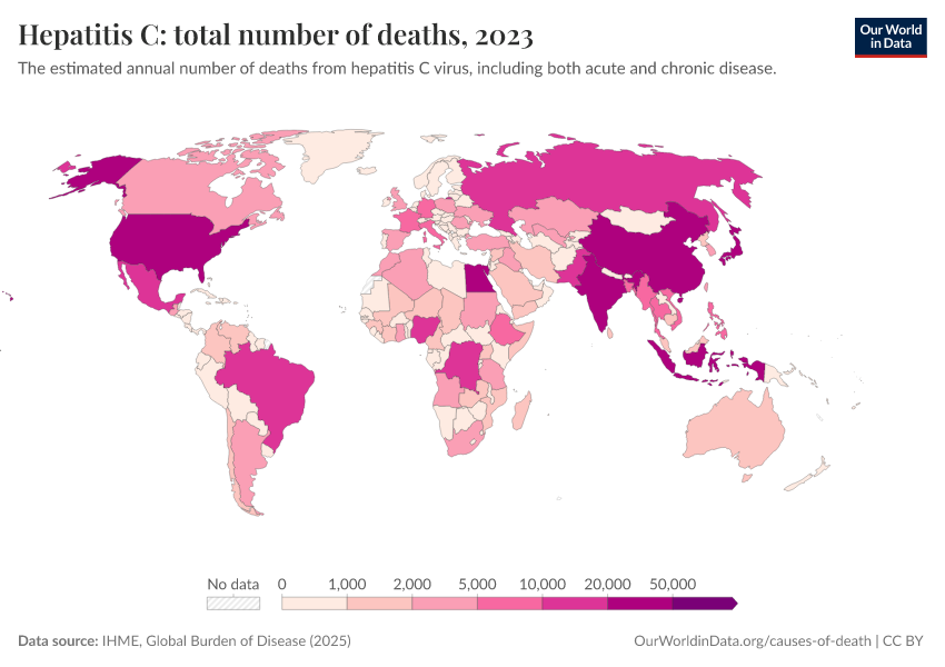 IHME, Global Burden of Disease (2025) – with major processing by Our World in Data. “Hepatitis C: total number of deaths” [dataset]. IHME, Global Burden of Disease, “Global Burden of Disease - Deaths” [original data]. Retrieved March 3, 2026 from https://country-profiles-in-search.owid.pages.dev/grapher/hepatitis-c-number-of-deaths