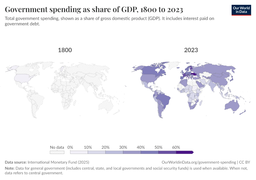 International Monetary Fund (2025) – with minor processing by Our World in Data. “Government spending as share of GDP” [dataset]. International Monetary Fund, “Public Finances in Modern History” [original data]. Retrieved March 3, 2026 from https://country-profiles-in-search.owid.pages.dev/grapher/historical-gov-spending-gdp