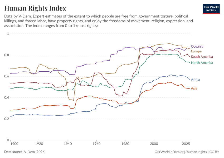 V-Dem (2025) – processed by Our World in Data. “Human rights index – V-Dem” [dataset]. V-Dem, “Democracy report v15” [original data]. Retrieved March 3, 2026 from https://country-profiles-in-search.owid.pages.dev/grapher/human-rights-index-vdem