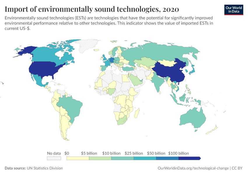 UN Statistics Division – processed by Our World in Data. “Import of environmentally sound technologies” [dataset]. UN Statistics Division, “WESR / UN COMTRADE” [original data]. Retrieved March 3, 2026 from https://country-profiles-in-search.owid.pages.dev/grapher/import-of-environmentally-sound-technologies