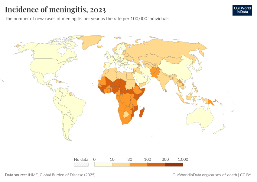 “Data Page: Incidence of meningitis”, part of the following publication: Esteban Ortiz-Ospina and Max Roser (2016) - “Global Health”. Data adapted from IHME, Global Burden of Disease. Retrieved from https://country-profiles-in-search.owid.pages.dev/grapher/incidence-of-meningitis [online resource]How to cite this data