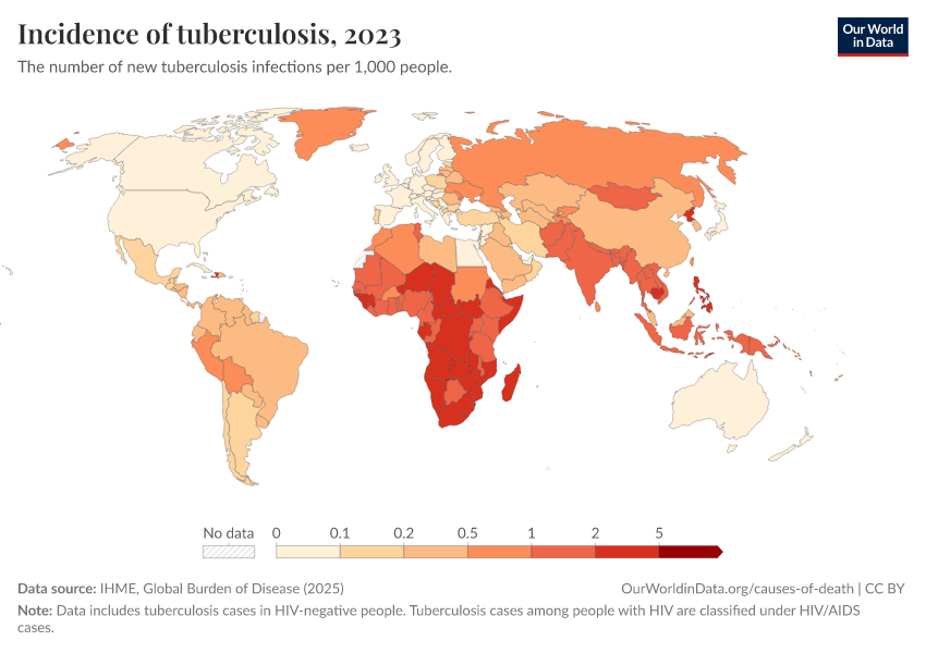 IHME, Global Burden of Disease (2025) – with major processing by Our World in Data. “Incidence of tuberculosis” [dataset]. IHME, Global Burden of Disease, “Global Burden of Disease - Prevalence and Incidence” [original data]. Retrieved March 3, 2026 from https://country-profiles-in-search.owid.pages.dev/grapher/incidence-of-tuberculosis