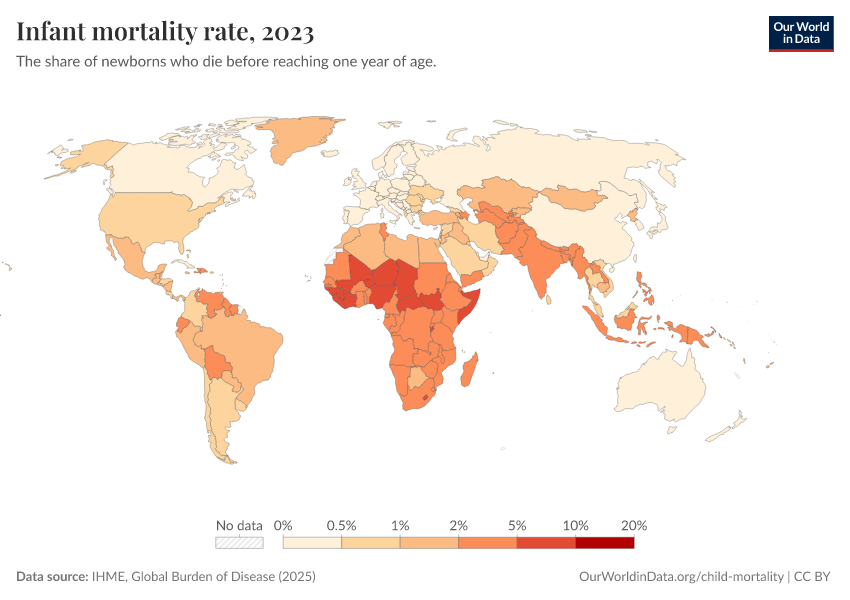 IHME, Global Burden of Disease (2025) – with minor processing by Our World in Data. “Infant mortality rate” [dataset]. IHME, Global Burden of Disease, “Global Burden of Disease - Child Mortality” [original data]. Retrieved March 3, 2026 from https://country-profiles-in-search.owid.pages.dev/grapher/infant-mortality-rate