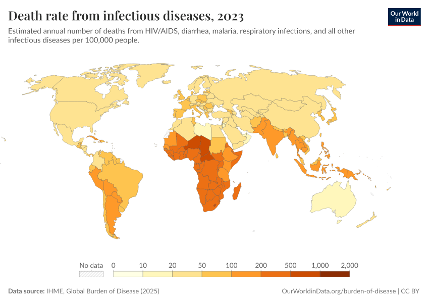 IHME, Global Burden of Disease (2025) – with major processing by Our World in Data. “Death rate from infectious diseases” [dataset]. IHME, Global Burden of Disease, “Global Burden of Disease - Deaths” [original data]. Retrieved March 3, 2026 from https://country-profiles-in-search.owid.pages.dev/grapher/infectious-disease-death-rates-gbd