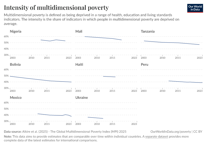 “Data Page: Intensity of multidimensional poverty”, part of the following publication: Joe Hasell, Bertha Rohenkohl, Pablo Arriagada, Esteban Ortiz-Ospina, and Max Roser (2022) - “Poverty”. Data adapted from Alkire et al.. Retrieved from https://country-profiles-in-search.owid.pages.dev/grapher/intensity-of-multidimensional-poverty-hot [online resource]How to cite this data