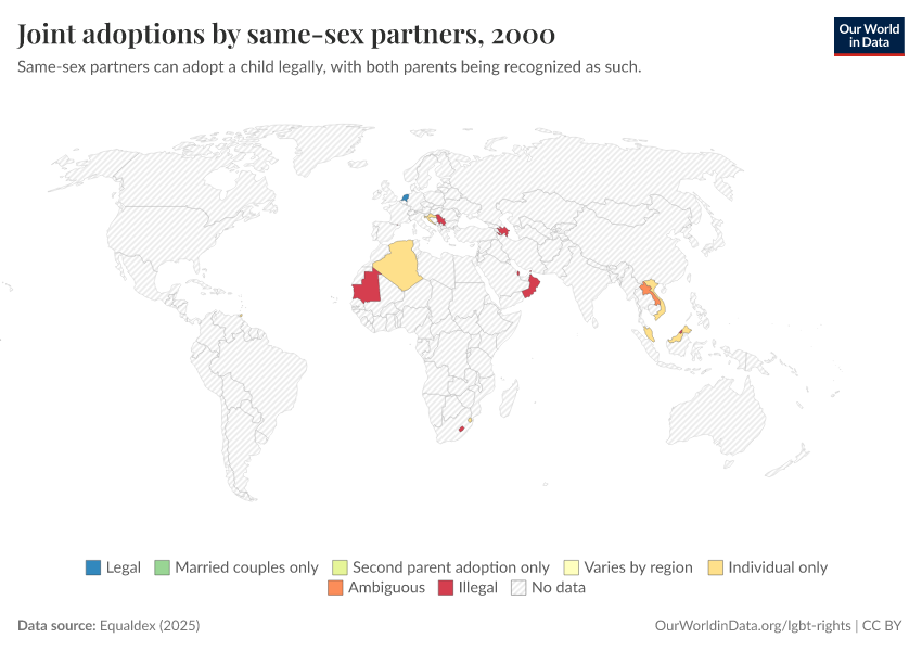 “Data Page: Joint adoptions by same-sex partners”, part of the following publication: Bastian Herre and Pablo Arriagada (2023) - “LGBT+ Rights”. Data adapted from Equaldex. Retrieved from https://country-profiles-in-search.owid.pages.dev/grapher/joint-adoptions-same-sex-partners-equaldex [online resource]How to cite this data