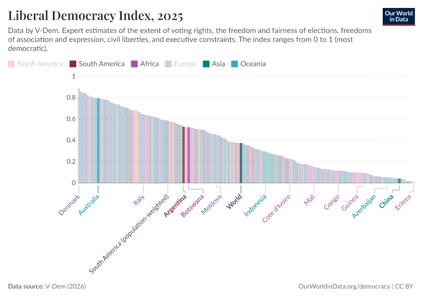 V-Dem (2025) – processed by Our World in Data. “Liberal democracy index – V-Dem” [dataset]. V-Dem, “Democracy report v15” [original data]. Retrieved March 3, 2026 from https://country-profiles-in-search.owid.pages.dev/grapher/liberal-democracy-index