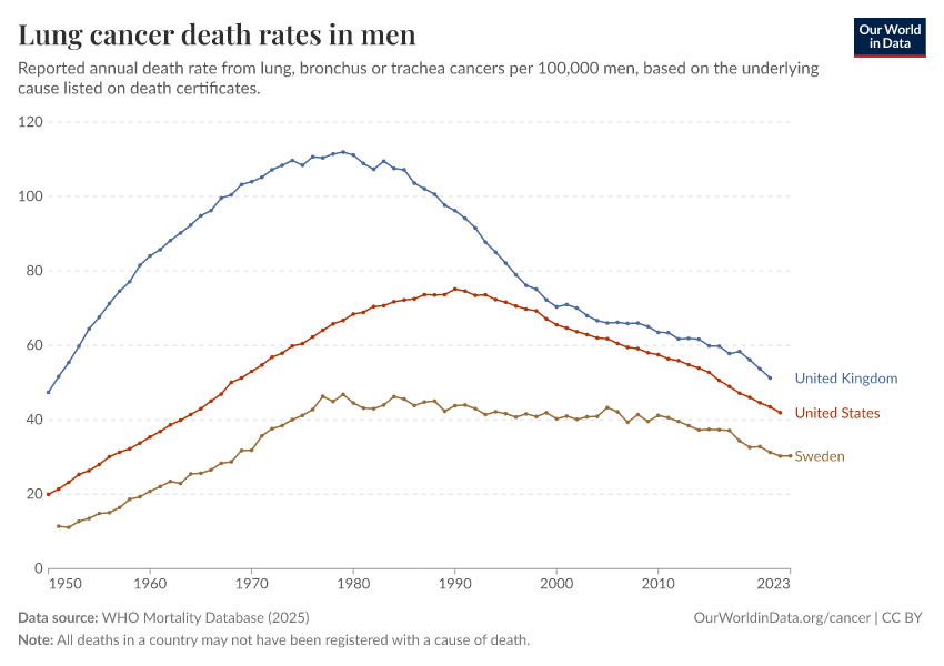 WHO Mortality Database (2025) – with minor processing by Our World in Data. “Lung cancer death rates in men” [dataset]. WHO Mortality Database, “WHO Mortality Database” [original data]. Retrieved March 3, 2026 from https://country-profiles-in-search.owid.pages.dev/grapher/lung-cancer-death-rates-males