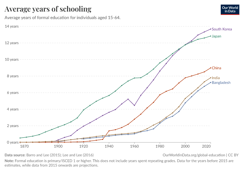 Barro and Lee (2015); Lee and Lee (2016) – with major processing by Our World in Data. “Average years of schooling” [dataset]. Barro and Lee, “Projections of Educational Attainment”; Lee and Lee, “Human Capital in the Long Run” [original data]. Retrieved March 3, 2026 from https://country-profiles-in-search.owid.pages.dev/grapher/mean-years-of-schooling-long-run