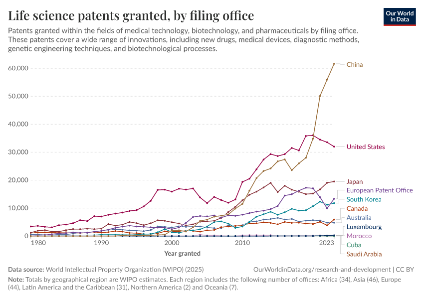 “Data Page: Life science patents granted, by filing office”. Our World in Data (2026). Data adapted from World Intellectual Property Organization (WIPO). Retrieved from https://country-profiles-in-search.owid.pages.dev/grapher/medicine-and-biotechnology-patents-granted-by-filing-office [online resource]How to cite this data