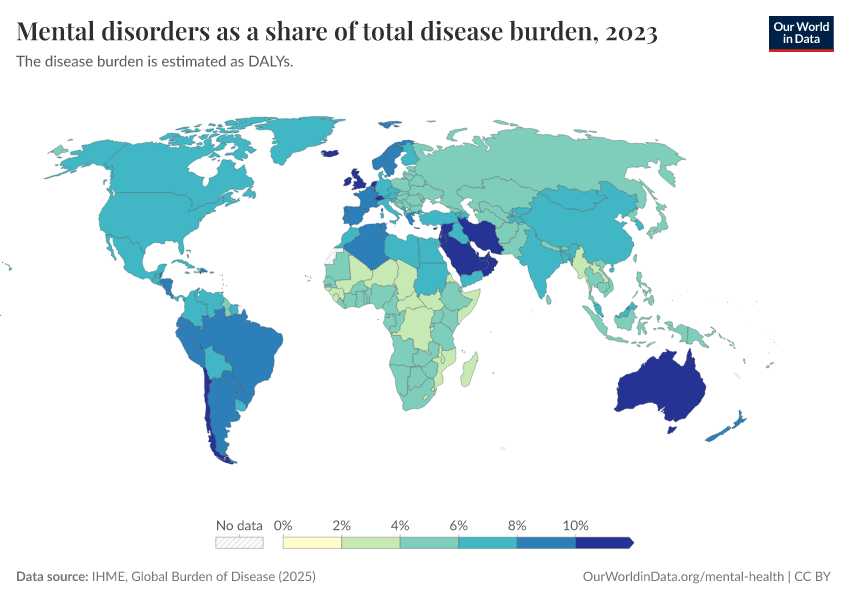 IHME, Global Burden of Disease (2025) – with major processing by Our World in Data. “Mental disorders as a share of total disease burden” [dataset]. IHME, Global Burden of Disease, “Global Burden of Disease - DALYs” [original data]. Retrieved March 3, 2026 from https://country-profiles-in-search.owid.pages.dev/grapher/mental-and-substance-use-as-share-of-disease