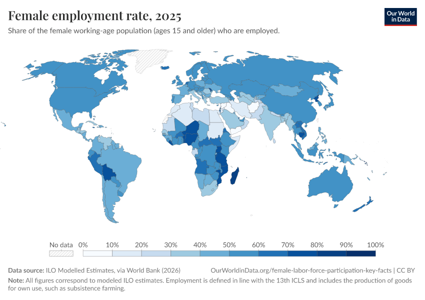 “Data Page: Female employment-to-population ratio”. Our World in Data (2026). Data adapted from ILO Modelled Estimates, via World Bank. Retrieved from https://country-profiles-in-search.owid.pages.dev/grapher/modeled-female-employment-to-population-ratio [online resource]How to cite this data
