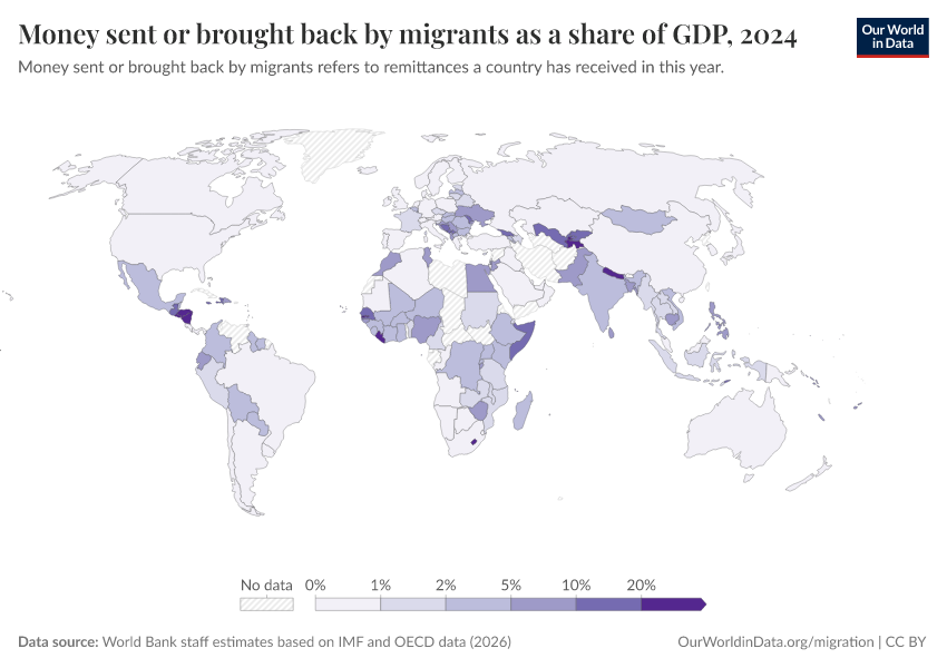 “Data Page: Money sent or brought back by migrants as a share of GDP”. Our World in Data (2026). Data adapted from World Bank staff estimates based on IMF and OECD data. Retrieved from https://country-profiles-in-search.owid.pages.dev/grapher/money-sent-or-brought-back-by-migrants-as-a-share-of-gdp [online resource]How to cite this data
