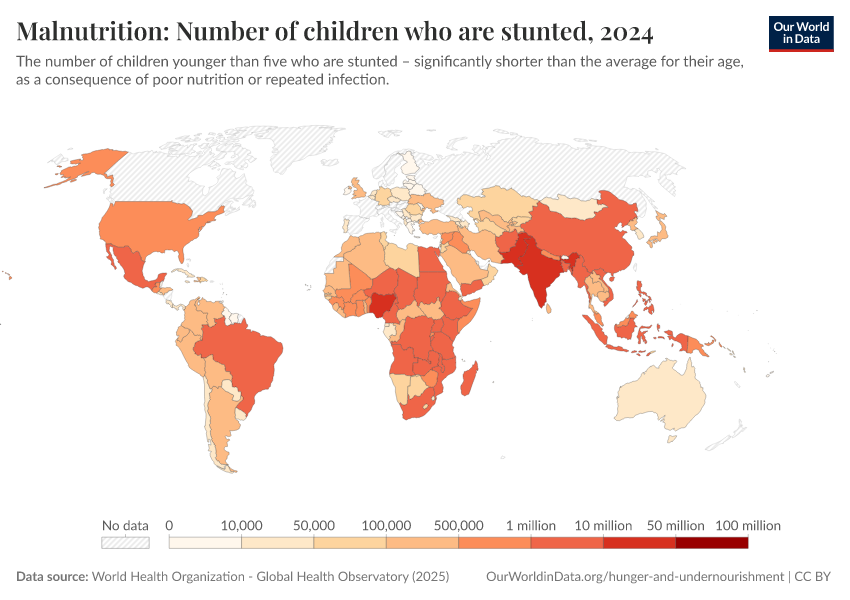 “Data Page: Malnutrition: Number of children who are stunted”. Our World in Data (2026). Data adapted from World Health Organization. Retrieved from https://country-profiles-in-search.owid.pages.dev/grapher/number-children-stunted-who [online resource]How to cite this data