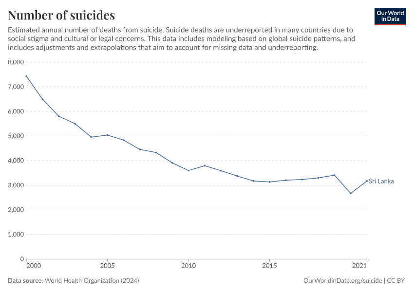 World Health Organization (2024) – with major processing by Our World in Data. “Number of suicides” [dataset]. World Health Organization, “Global Health Estimates” [original data]. Retrieved March 3, 2026 from https://country-profiles-in-search.owid.pages.dev/grapher/number-of-deaths-from-suicide-ghe