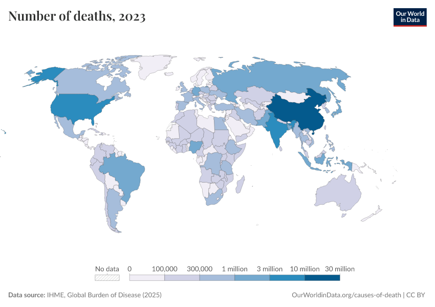 IHME, Global Burden of Disease (2025) – with major processing by Our World in Data. “Number of deaths” [dataset]. IHME, Global Burden of Disease, “Global Burden of Disease - Deaths” [original data]. Retrieved March 3, 2026 from https://country-profiles-in-search.owid.pages.dev/grapher/number-of-deaths-gbd