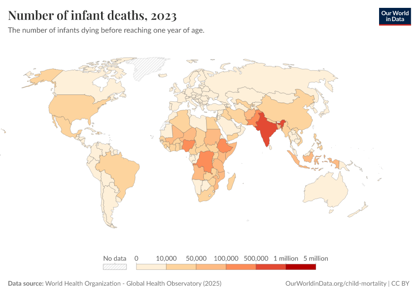 World Health Organization - Global Health Observatory (2025) – processed by Our World in Data. “Number of infant deaths” [dataset]. World Health Organization, “Global Health Observatory” [original data]. Retrieved March 3, 2026 from https://country-profiles-in-search.owid.pages.dev/grapher/number-of-infant-deaths-gho