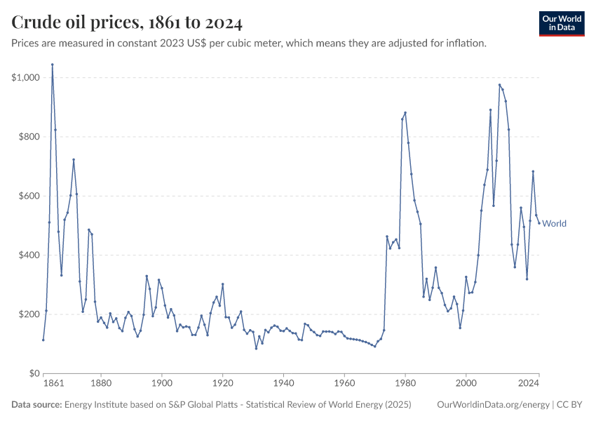 “Data Page: Oil price - Crude prices since 1861”, part of the following publication: Hannah Ritchie, Pablo Rosado, and Max Roser (2023) - “Energy”. Data adapted from Energy Institute. Retrieved from https://country-profiles-in-search.owid.pages.dev/grapher/oil-prices-inflation-adjusted [online resource]How to cite this data
