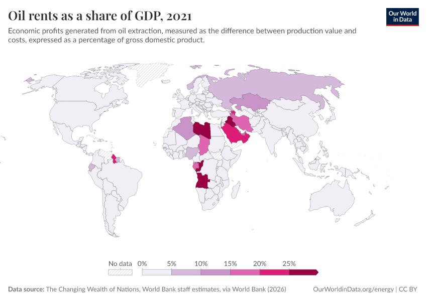 The Changing Wealth of Nations, World Bank staff estimates, via World Bank (2026) – processed by Our World in Data. “Oil rents as a share of GDP” [dataset]. The Changing Wealth of Nations, World Bank staff estimates, via World Bank, “World Development Indicators 125” [original data]. Retrieved March 3, 2026 from https://country-profiles-in-search.owid.pages.dev/grapher/oil-rents-as-a-share-of-gdp
