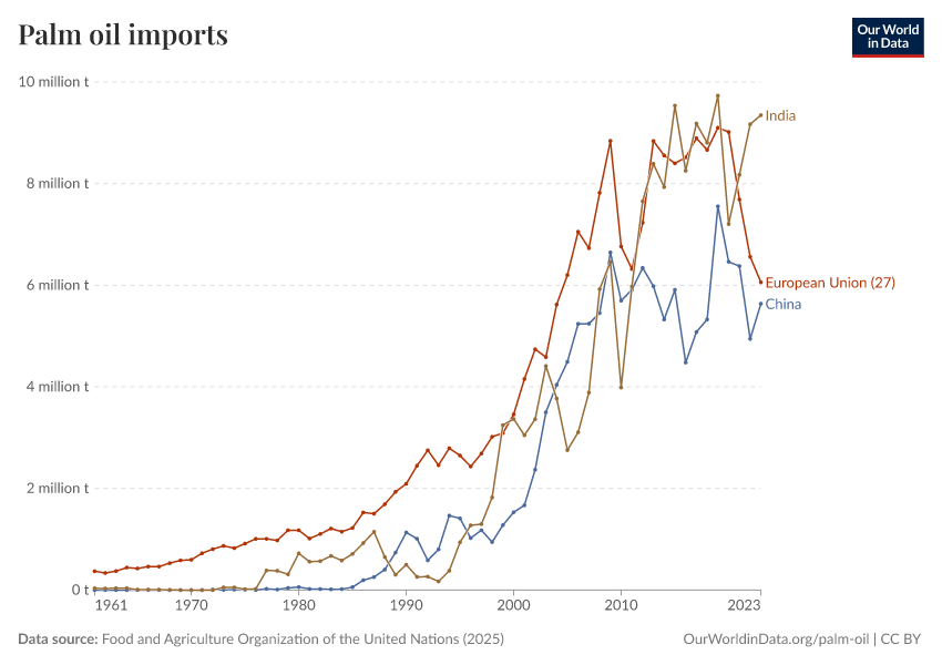 “Data Page: Imports of palm oil”. Our World in Data (2026). Data adapted from Food and Agriculture Organization of the United Nations. Retrieved from https://country-profiles-in-search.owid.pages.dev/grapher/palm-oil-imports [online resource]How to cite this data