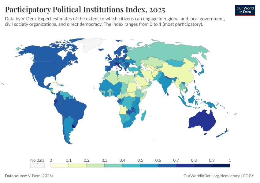 V-Dem (2025) – processed by Our World in Data. “Participatory political institutions – V-Dem” [dataset]. V-Dem, “Democracy report v15” [original data]. Retrieved March 3, 2026 from https://country-profiles-in-search.owid.pages.dev/grapher/participatory-political-institutions-index