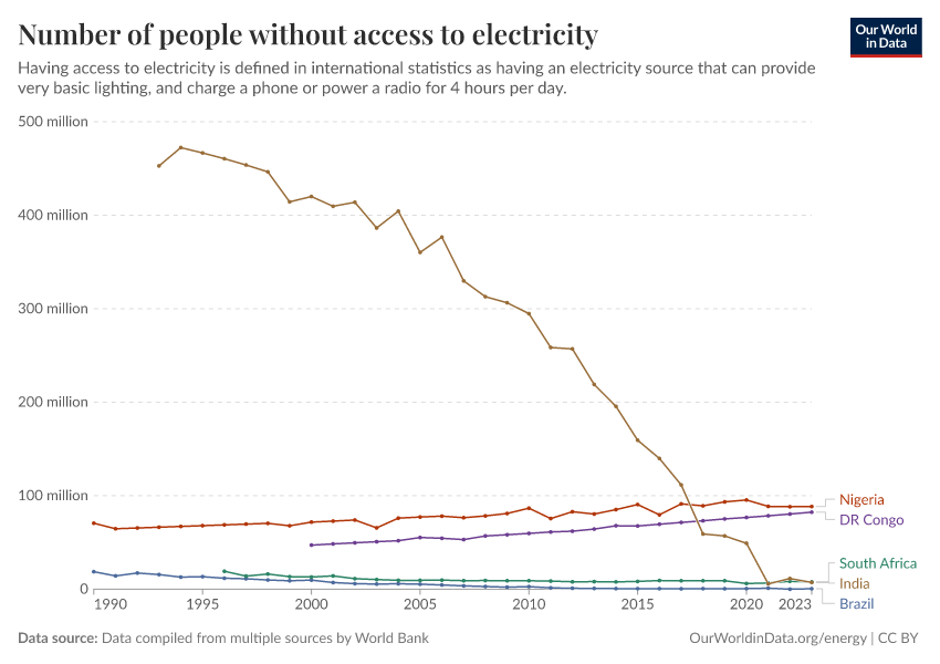 Data compiled from multiple sources by World Bank – with major processing by Our World in Data. “Number of people without access to electricity – World Bank” [dataset]. SDG 7.1.1 Electrification Dataset, World Bank, via World Bank, “World Development Indicators 125”; United Nations Population Division, national statistical offices, and Eurostat, via World Bank, “World Development Indicators 125” [original data]. Retrieved March 3, 2026 from https://country-profiles-in-search.owid.pages.dev/grapher/people-without-electricity-country