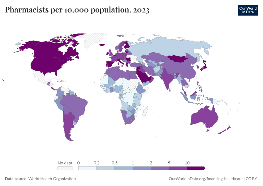 “Data Page: Pharmacists per 10,000 population”. Our World in Data (2026). Data adapted from World Health Organization. Retrieved from https://country-profiles-in-search.owid.pages.dev/grapher/pharmaceutical-personnel-per-1000 [online resource]How to cite this data