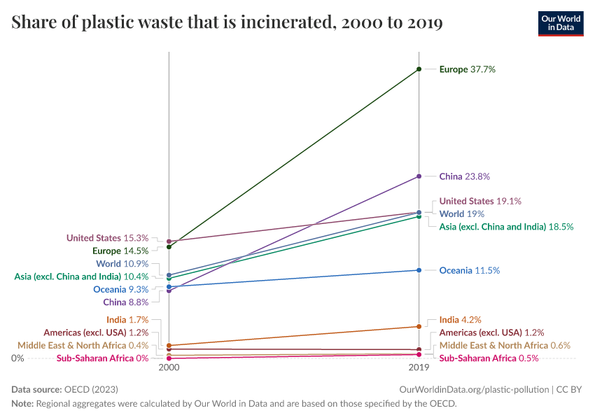 OECD (2023) – processed by Our World in Data. “Share of plastic waste that is incinerated” [dataset]. OECD, “Global Plastics Outlook - Plastics waste by region and end-of-life fate” [original data]. Retrieved March 3, 2026 from https://country-profiles-in-search.owid.pages.dev/grapher/plastic-waste-incinerated