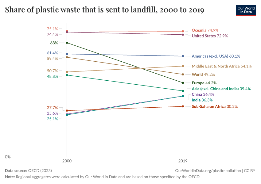 “Data Page: Share of plastic waste that is sent to landfill”, part of the following publication: Hannah Ritchie, Veronika Samborska, and Max Roser (2023) - “Plastic Pollution”. Data adapted from OECD. Retrieved from https://country-profiles-in-search.owid.pages.dev/grapher/plastic-waste-landfill [online resource]How to cite this data