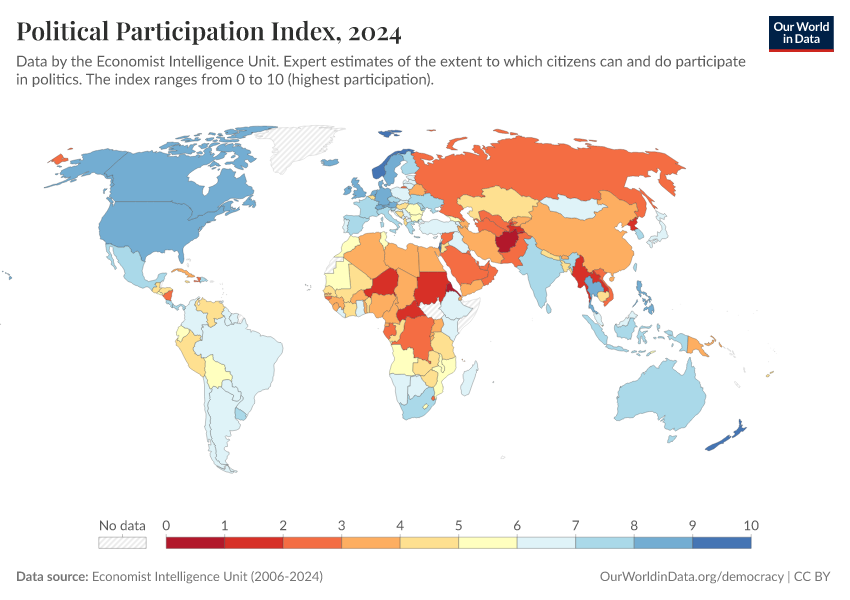 Economist Intelligence Unit (2006-2024) – processed by Our World in Data. “Political Participation Index” [dataset]. Economist Intelligence Unit, “Democracy Index 2021: The China challenge”; Economist Intelligence Unit, “Democracy Index 2022: Frontline democracy and the battle for Ukraine”; Economist Intelligence Unit, “Democracy Index 2023: Age of Conflict”; Economist Intelligence Unit, “Democracy Index 2024: What's wrong with representative democracy?”; Gapminder, “Democracy Index v4”; Various sources, “Population” [original data]. Retrieved March 3, 2026 from https://country-profiles-in-search.owid.pages.dev/grapher/political-participation-index-eiu