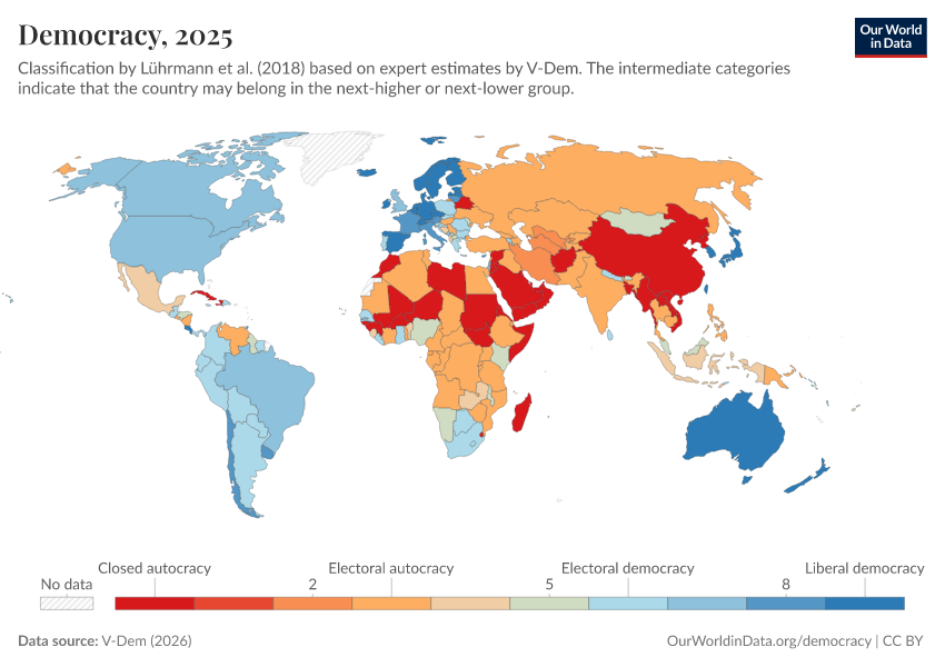 V-Dem (2025) – processed by Our World in Data. “Political regime – inc. ambiguous categories” [dataset]. V-Dem, “Democracy report v15” [original data]. Retrieved March 3, 2026 from https://country-profiles-in-search.owid.pages.dev/grapher/political-regime-amb-row