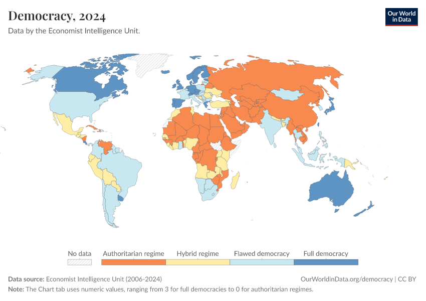 Economist Intelligence Unit (2006-2024) – processed by Our World in Data. “Democracy” [dataset]. Economist Intelligence Unit, “Democracy Index 2021: The China challenge”; Economist Intelligence Unit, “Democracy Index 2022: Frontline democracy and the battle for Ukraine”; Economist Intelligence Unit, “Democracy Index 2023: Age of Conflict”; Economist Intelligence Unit, “Democracy Index 2024: What's wrong with representative democracy?”; Gapminder, “Democracy Index v4” [original data]. Retrieved March 3, 2026 from https://country-profiles-in-search.owid.pages.dev/grapher/political-regime-eiu