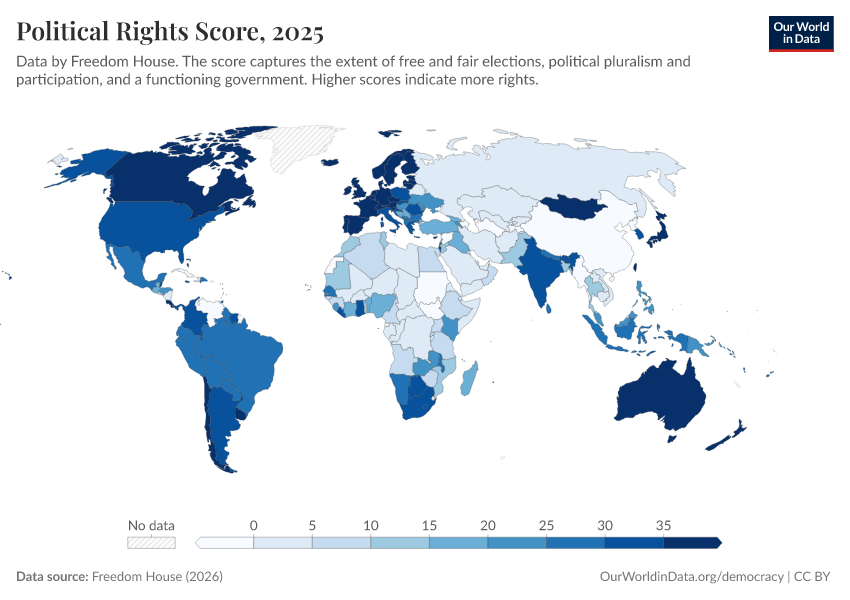 Freedom House (2025) – processed by Our World in Data. “Political Rights Score” [dataset]. Freedom House, “Freedom in the World” [original data]. Retrieved March 3, 2026 from https://country-profiles-in-search.owid.pages.dev/grapher/political-rights-score-fh