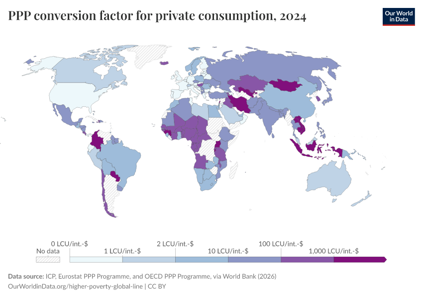 “Data Page: PPP conversion factor for private consumption”. Our World in Data (2026). Data adapted from ICP, Eurostat PPP Programme, and OECD PPP Programme, via World Bank. Retrieved from https://country-profiles-in-search.owid.pages.dev/grapher/ppp-conversion-factor-for-private-consumption [online resource]How to cite this data