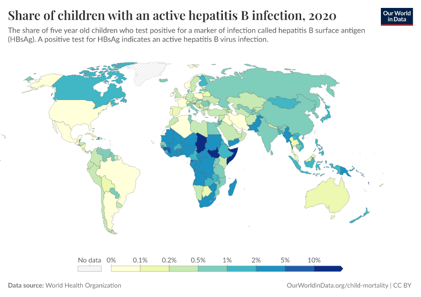 “Data Page: Share of children with an active hepatitis B infection”. Our World in Data (2026). Data adapted from World Health Organization. Retrieved from https://country-profiles-in-search.owid.pages.dev/grapher/prevalence-of-hepatitis-b-surface-antigen [online resource]How to cite this data