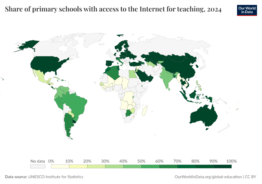 “Data Page: Share of primary schools with access to the Internet for teaching”. Our World in Data (2026). Data adapted from UNESCO Institute for Statistics. Retrieved from https://country-profiles-in-search.owid.pages.dev/grapher/primary-schools-with-access-to-internet [online resource]How to cite this data