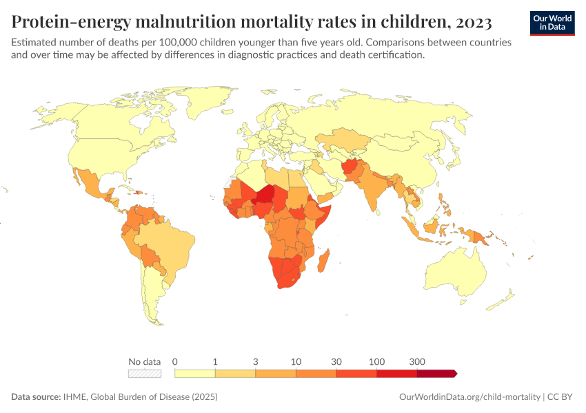 IHME, Global Burden of Disease (2025) – with major processing by Our World in Data. “Protein-energy malnutrition mortality rates in children ” [dataset]. IHME, Global Burden of Disease, “Global Burden of Disease - Deaths” [original data]. Retrieved March 3, 2026 from https://country-profiles-in-search.owid.pages.dev/grapher/protein-energy-malnutrition-mortality-rates-in-children