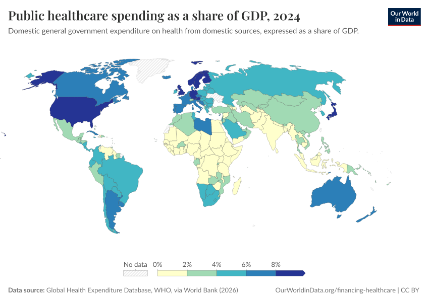 “Data Page: Public healthcare spending as a share of GDP”. Our World in Data (2026). Data adapted from Global Health Expenditure Database, WHO, via World Bank. Retrieved from https://country-profiles-in-search.owid.pages.dev/grapher/public-healthcare-spending-share-gdp [online resource]How to cite this data