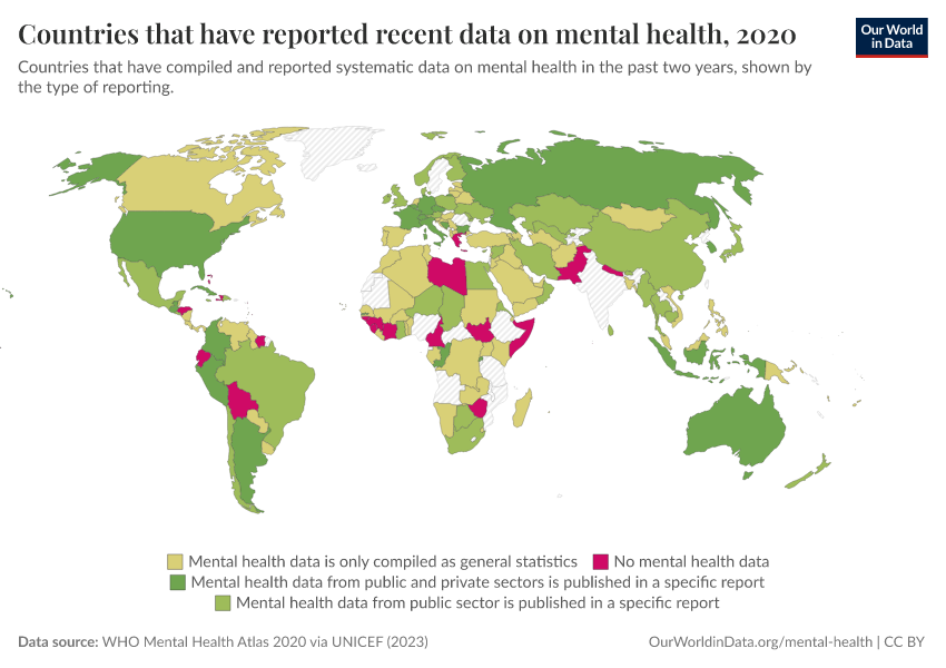 “Data Page: Countries that have reported recent data on mental health”, part of the following publication: Saloni Dattani, Lucas Rodés-Guirao, Hannah Ritchie, and Max Roser (2023) - “Mental Health”. Data adapted from WHO Mental Health Atlas 2020 via UNICEF. Retrieved from https://country-profiles-in-search.owid.pages.dev/grapher/reporting-of-mental-health-system-data-in-the-past-two-years [online resource]How to cite this data