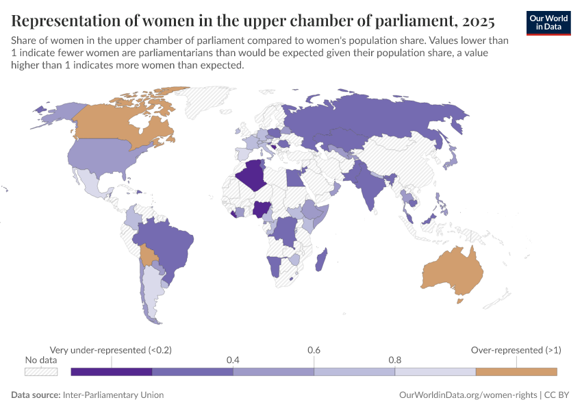 “Data Page: Representation of women in the upper chamber of parliament”. Our World in Data (2026). Data adapted from Inter-Parliamentary Union. Retrieved from https://country-profiles-in-search.owid.pages.dev/grapher/representation-of-women-in-the-upper-chamber-of-parliament [online resource]How to cite this data
