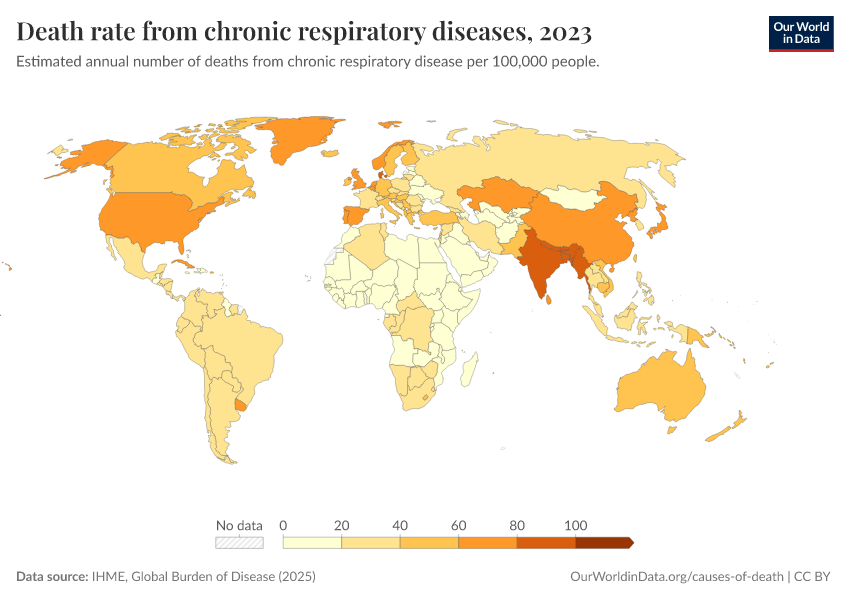 IHME, Global Burden of Disease (2025) – with major processing by Our World in Data. “Death rate from chronic respiratory diseases” [dataset]. IHME, Global Burden of Disease, “Global Burden of Disease - Deaths” [original data]. Retrieved March 3, 2026 from https://country-profiles-in-search.owid.pages.dev/grapher/respiratory-disease-death-rate-gbd