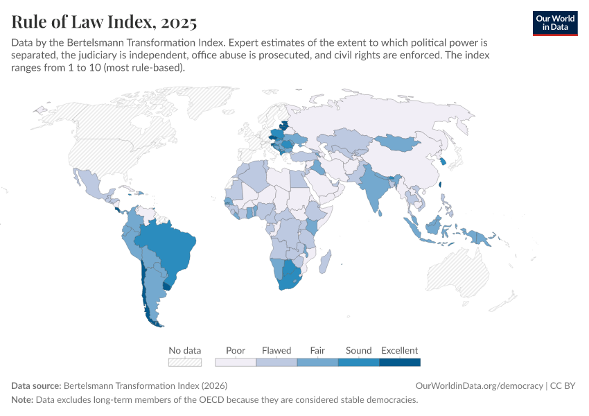 “Data Page: Rule of Law Index”, part of the following publication: Bastian Herre, Lucas Rodés-Guirao, and Esteban Ortiz-Ospina (2013) - “Democracy”. Data adapted from Bertelsmann Transformation Index. Retrieved from https://country-profiles-in-search.owid.pages.dev/grapher/rule-of-law-index-bti [online resource]How to cite this data