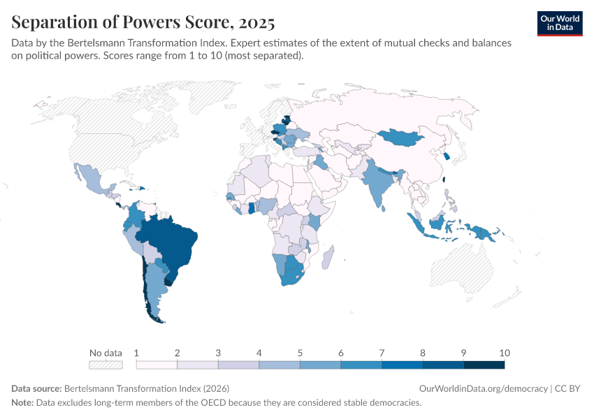 Bertelsmann Transformation Index (2024) – processed by Our World in Data. “Separation of Powers Score” [dataset]. Bertelsmann Transformation Index, “Bertelsmann Transformation Index, Scores” [original data]. Retrieved March 3, 2026 from https://country-profiles-in-search.owid.pages.dev/grapher/separation-of-powers-score-bti