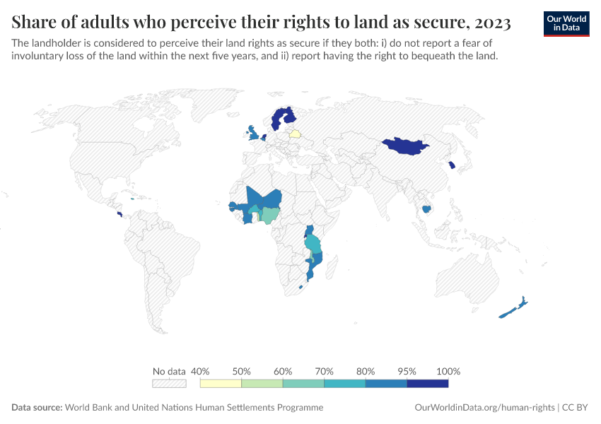 World Bank and United Nations Human Settlements Programme – processed by Our World in Data. “Share of adults who perceive their rights to land as secure” [dataset]. World Bank and United Nations Human Settlements Programme, “Data from multiple sources” [original data]. Retrieved March 3, 2026 from https://country-profiles-in-search.owid.pages.dev/grapher/share-of-adults-who-perceive-their-rights-to-land-as-secure
