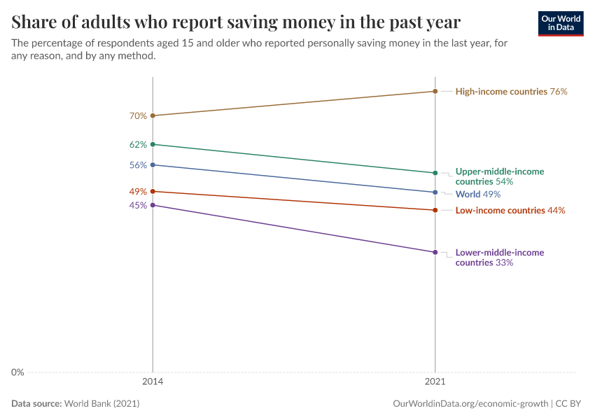 “Data Page: Share of adults who report saving money in the past year”, part of the following publication: Max Roser, Bertha Rohenkohl, Pablo Arriagada, Joe Hasell, Hannah Ritchie, and Esteban Ortiz-Ospina (2023) - “Economic Growth”. Data adapted from World Bank. Retrieved from https://country-profiles-in-search.owid.pages.dev/grapher/share-of-adults-who-report-saving-money-in-the-past-year [online resource]How to cite this data