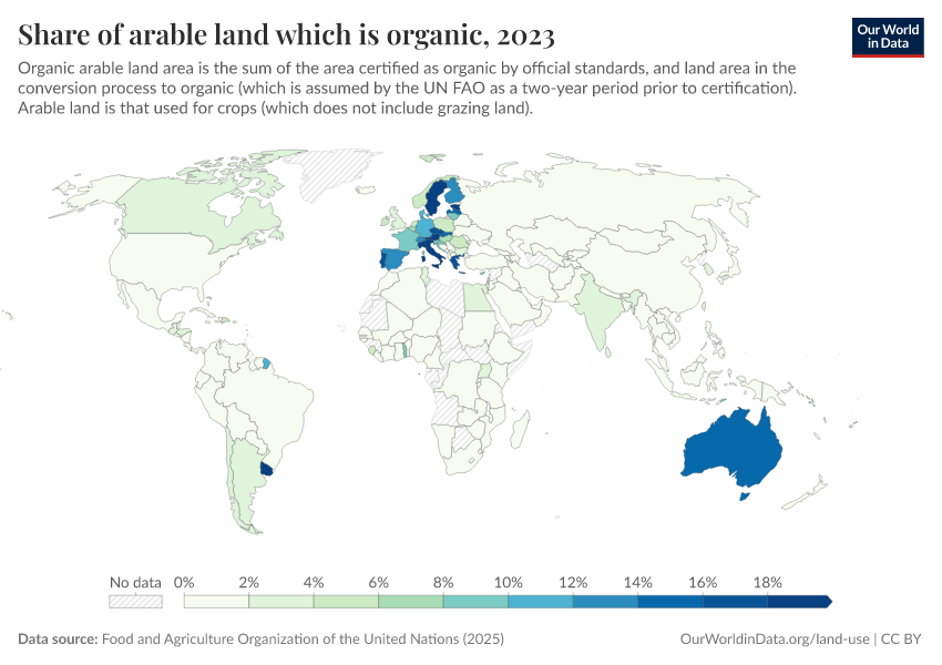 Food and Agriculture Organization of the United Nations (2024) – with major processing by Our World in Data. “Share of arable land that is organic – UN FAO” [dataset]. Food and Agriculture Organization of the United Nations, “Land, Inputs and Sustainability: Land Use” [original data]. Retrieved March 3, 2026 from https://country-profiles-in-search.owid.pages.dev/grapher/share-of-arable-land-which-is-organic