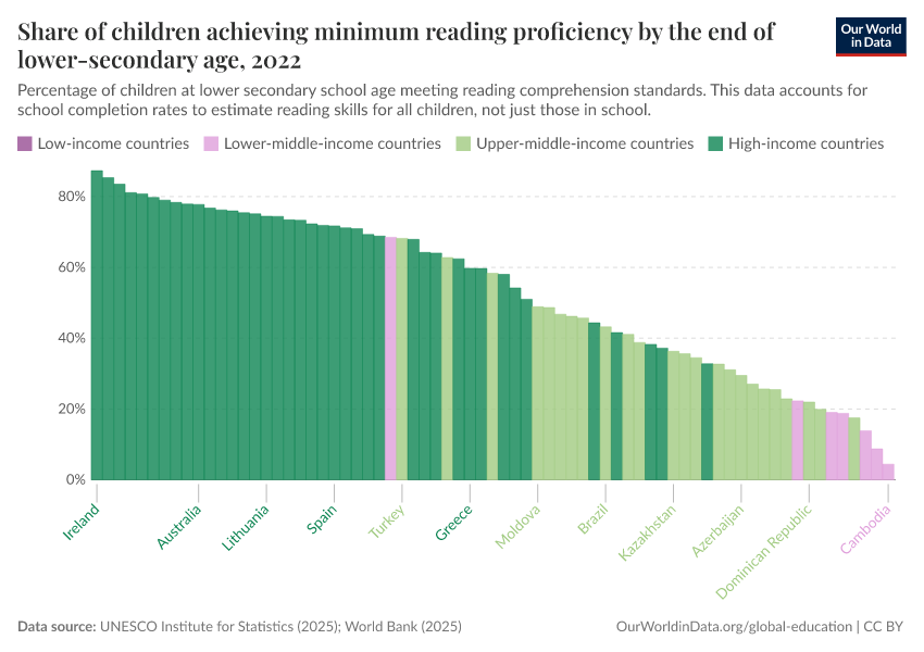“Data Page: Share of children achieving minimum reading proficiency by the end of lower secondary age”, part of the following publication: Hannah Ritchie, Veronika Samborska, Esteban Ortiz-Ospina, and Max Roser (2023) - “Global Education”. Data adapted from UNESCO Institute for Statistics. Retrieved from https://country-profiles-in-search.owid.pages.dev/grapher/share-of-children-reaching-sufficient-reading-comprehension-by-the-end-of-lower-secondary-age [online resource]How to cite this data