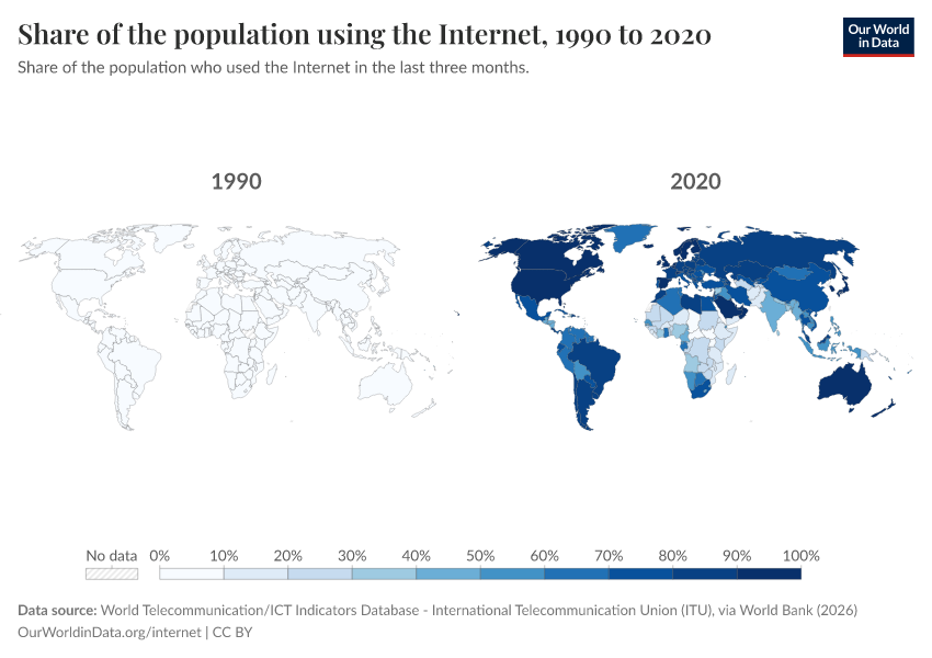 World Telecommunication/ICT Indicators Database - International Telecommunication Union (ITU), via World Bank (2026) – with minor processing by Our World in Data. “Share of the population using the Internet – International Telecommunication Union” [dataset]. World Telecommunication/ICT Indicators Database - International Telecommunication Union (ITU), via World Bank, “World Development Indicators 125” [original data]. Retrieved March 3, 2026 from https://country-profiles-in-search.owid.pages.dev/grapher/share-of-individuals-using-the-internet